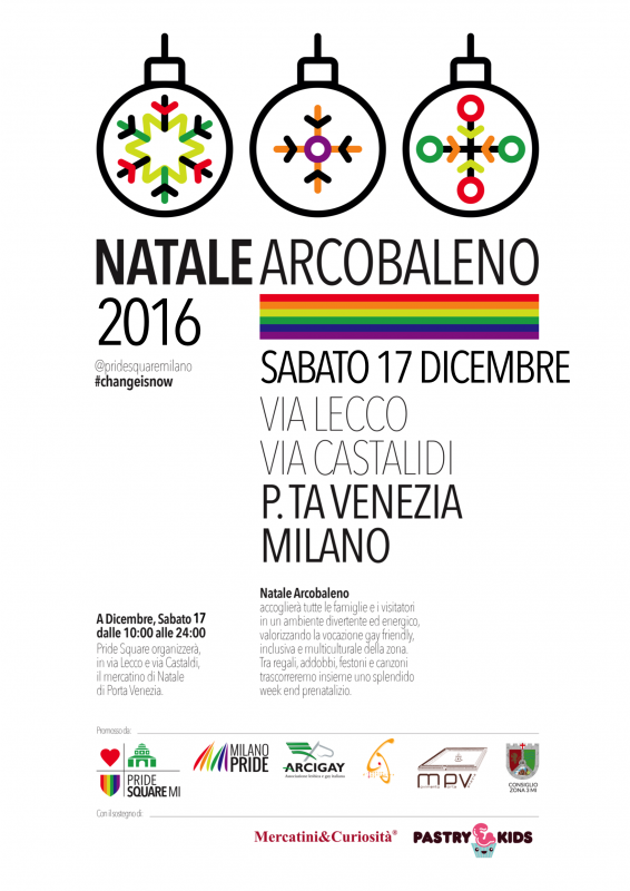 Natale Arcobaleno in Pride Square prevede la realizzazione di un mercatino natalizio e l’organizzazione di alcuni eventi dedicati ai bambini e alle famiglie.