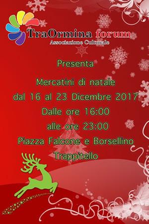 L'Amministrazione comunale di Taormina programma il Natale 2017. Per quanto concerne il Mercatino di Natale 2017 nella frazione di Trappitello in piazza Falcone e Borsellino, l'Amministrazione, si avvale dell’associazione culturale TraOrmina forum che ha manifestato con la presente la disponibilità ad assumersi l’impegno dell’organizzazione dell’evento e nell’ambito del mercatino natalizio e di spettacoli d’intrattenimento.
