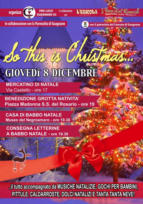 Si accende la magia del Natale a Guagnano (LE). Si chiama "So this is Christmas" ed è l'evento organizzato dalla Pro Loco Guagnano '93 in collaborazione con L'Edicola, Il Paese dei Balocchi e la Parrocchia S. Maria Assunta, in programma a Guagnano l'8 dicembre prossimo. Nel giorno dedicato alla Madonna Immacolata, a partire dalle 17, la piazza centrale del paese, il Museo del Negroamaro e via Castello si vestiranno a festa per inaugurare al meglio l'avvio delle festività natalizie.