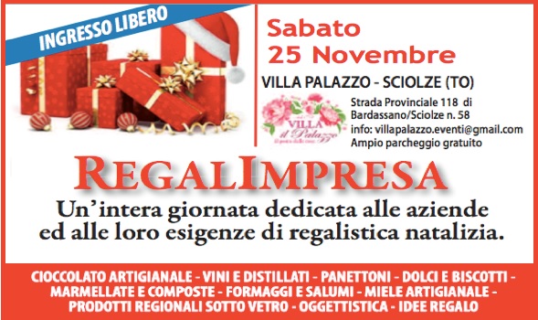 Avete un azienda e state già pensando ai regali natalizi, a un omaggio per i vostri clienti, e siete in crisi sulla scelta? L'evento di sabato 25 novembre nella splendida cornice e nei giardini di Villa Palazzo (Strada Provinciale 118 n. 58) di Sciolze (Torino) – dedicato alle aziende e alle loro esigenze di regalistica natalizia - potrebbe risolvere i vostri dubbi: puntare su un pacchetto regalo che valorizzi le eccellenze enogastronomiche del territorio! Diverse aziende si troveranno ad esporre i loro prodotti, tutti regolarmente artigianali, con la possibilità di creare composizioni e cestini di vario tipo, coinvolgendo le diverse realtà presenti all'evento. Gli espositori porteranno cioccolato artigianale, vini e distillati, panettoni, dolci e biscotti, marmellate e composte, formaggi e salumi, miele artigianale, prodotti regionali sotto vetro, oggettistica e tante altre idee regalo.