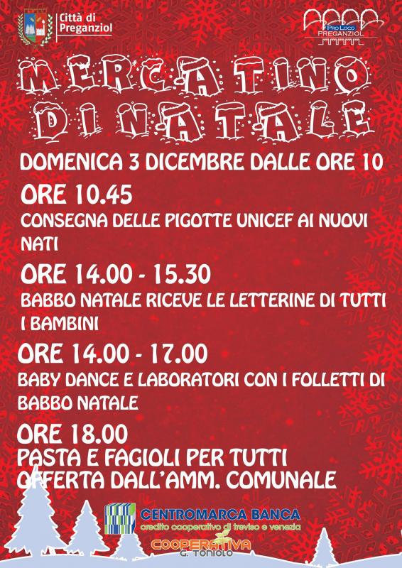 Domencia 3 dicembre 2017, dalle ore 10 alle ore 18, sarà organizzato il Mercatino di Natale a Preganziol, con espositori e spettacoli per bambini.