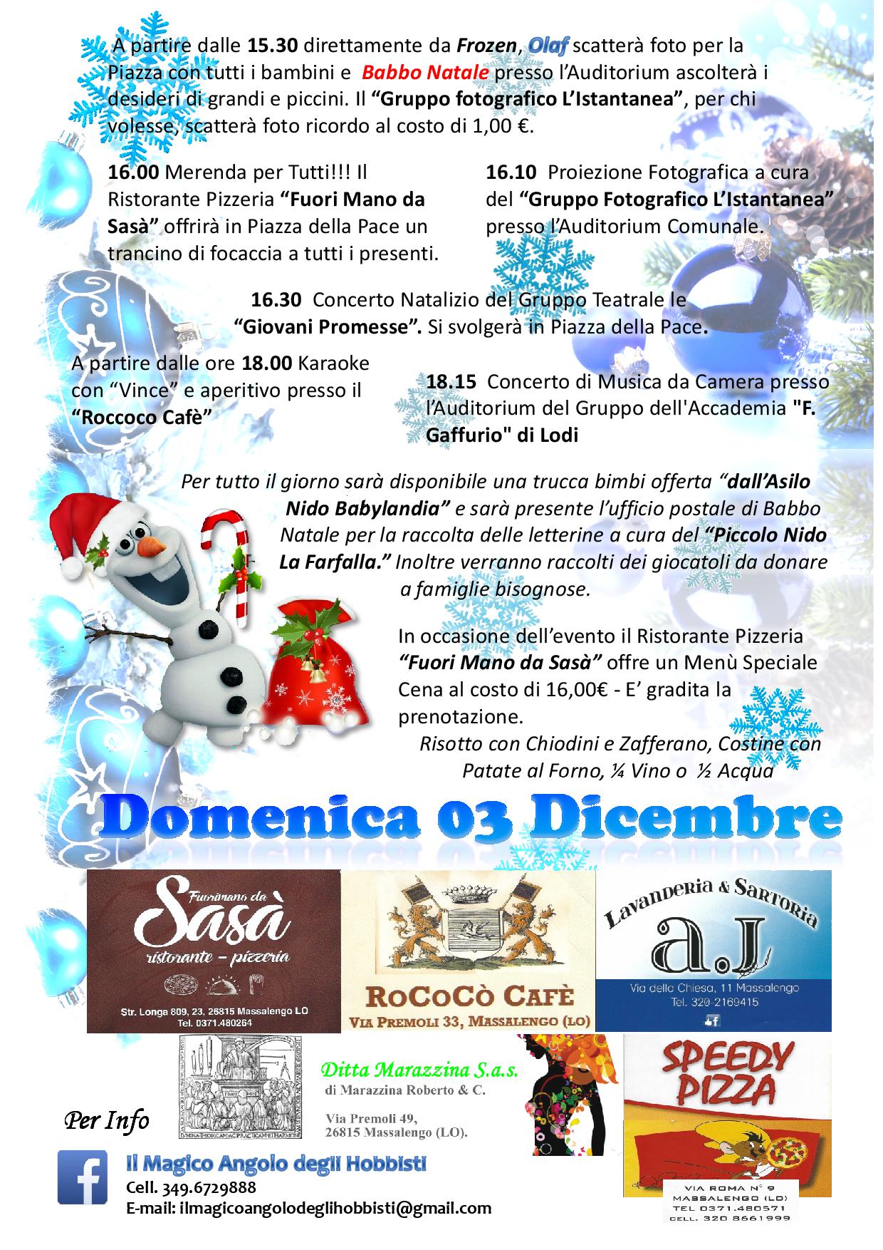 Potrai farti trasportare nell’Atmosfera Natalizia sulle note del Concerto di Natale delle Giovani Promesse in Piazza della Pace bevendo un buon Vin Brulè offerto davanti all’oratorio . Alle 16.00 non mancare per far merenda con OLAF!!! Focaccia gratis per tutti!