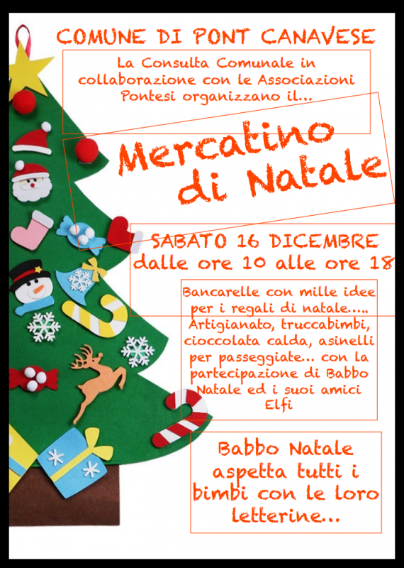 "Sabato 16 dicembre dalle ore 10.00 alle ore 18.00 Pont Canavese ospiterà il mercatino di Natale con tante idee regalo, truccabimbi, cioccolata calda, asinelli per passeggiate e la partecipazione di Babbo Natale con possibilità per tutti i bimbi di consegnare la loro letterina"