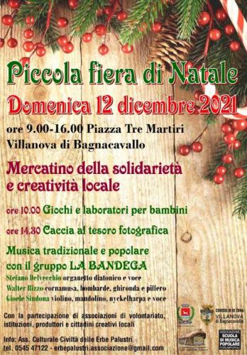 Domenica 12 dicembre 2021 a Villanova di Bagnacavallo si svolgerà la Piccola Fiera di Natale, iniziativa che ha lo scopo di animare il centro del paese coinvolgendo la comunità attraverso la collaborazione delle varie associazioni di volontariato, istituzioni, produttori e singoli cittadini.