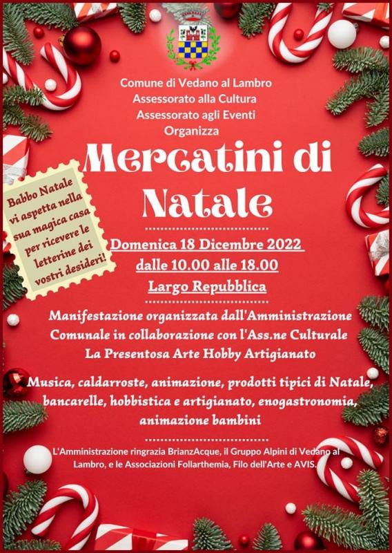 Presso Largo Repubblica a Vedano al Lambro in provincia di Monnza e Brianza si svolgono nella giornata di Domenica 18 Dicembre 2022, dalle ore 10.00 alle ore 18.00, i Mercatini di Natale.