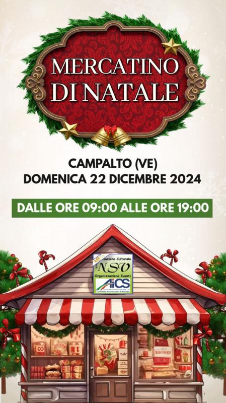 L'Associazione Culturale NSV Organizzazione Eventi APS affiliata A.I.C.S. - Comitato Provinciale di Rovigo, sarà presente a Campalto (VE) in occasione dei Festeggiamenti Natalizi, nella giornata di Domenica 22 Dicembre 2024, in Piazzale San Benedetto e Via Orlanda, dalle ore 09:00 alle ore 19:00 con il Mercatino di Natale delle Tradizioni Popolari, dell'Artigianato Artistico e delle Opere d'Ingegno Creativo con curiose ed originali Idee Regalo per la Casa ed il Tempo Libero con dimostrazioni pratiche delle tecniche di lavorazione sul posto, la rassegna dei Prodotti Enogastronomici Tipici Regionali ed Italiani con Degustazioni e Specialità Alimentari Dolci e Salate Stagionali prodotti artigianalmente per esaltare i Gusti e i Sapori di una tradizione antica ormai persa. Non mancheranno Stand dedicati alla Salute Naturale con Prodotti, Rimedi e Servizi che favoriscono il Benessere, la Cura del Corpo e il Vivere Sano in modo armonioso e sostenibile.Il programma della Manifestazione prevede Laboratori Didattici, Spettacoli, Truccabimbi ed Animazioni varie per Bambini.E' prevista inoltre la seconda edizione della Corsa dei Babbi Natale "Coremo soto Nadal".