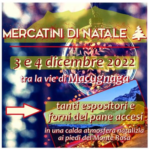 A Macugnaga tornano Dal 03/12/2022 ore 09:00 al 04/12/2022 ore 21:00 ,i “Mercatini di Natale”, bancarelle con oggettistica natalizia, manufatti locali di artigianato, il tutto con lo sfondo del Monte Rosa innevato e pronto per la stagione invernale sciistica.