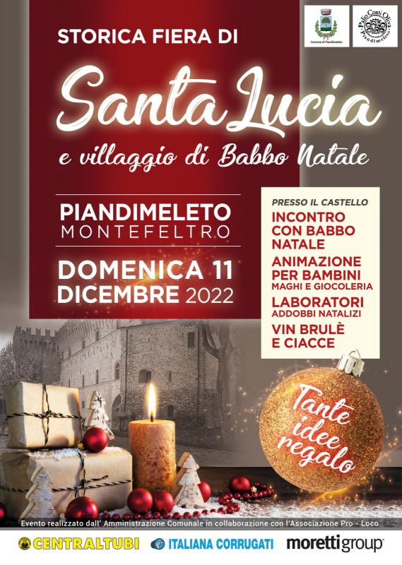 Domenica 11 Dicembre, nella via principale di Piandimeleto si svolgerà la Fiera di Santa Lucia, con bancarelle di ogni genere e mercatini natalizi con stand gastronomici e vin brulè, musica e balli e tante idee regalo.