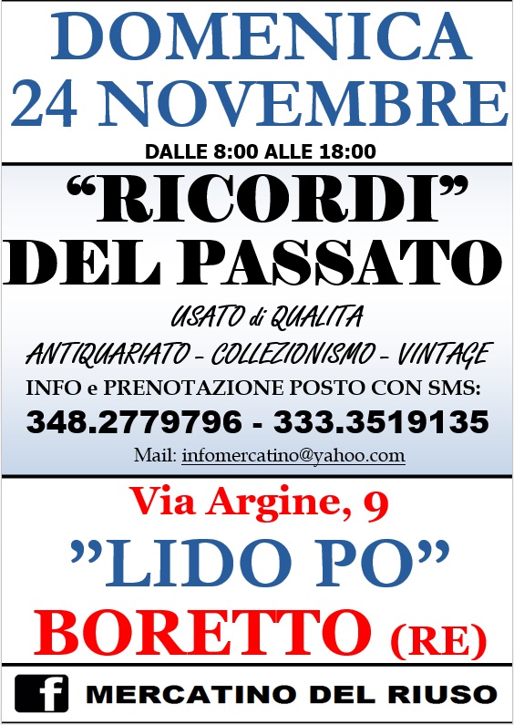 Domenica 24 NOVEMBRE 2019 torna al Lido Po di Boretto il MERCATINO VINTAGE - USATO DI QUALITA' - ANTIQUARIATO - ARTIGIANATO - COLLEZIONISMO - HOBBY.
