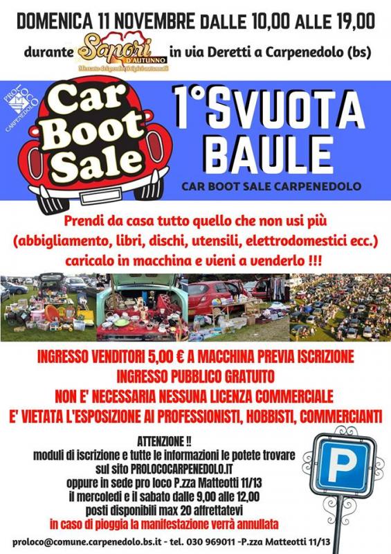 “Una giornata dedicata al riciclo proposta dalla Pro Loco di Carpenedolo (bs)Il Car boot sale (vendita dal baule della macchina) è un evento in cui i cittadini si riuniscono e con un banchetto o su un telo o stendiabiti davanti al proprio cofano vendono a poco prezzo le cose che non vogliono più.