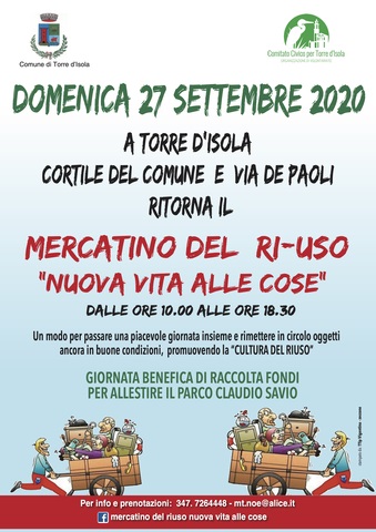 Domenica 27 Settembre 2020, torna per le strade di Torre d’Isola il Mercatino del Riuso: la manifestazione prenderà il via dalle 10 del mattino con i colori, le forme, gli oggetti dalle molteplici vite in vendita al Mercatino del Ri-Uso – Nuova Vita alle Cose, ideato dall’Agenzia Culturale Arca di Noè in collaborazione con il Comune di Torre d’Isola.