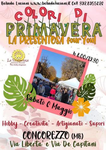 L'associazione La Presentosa Arte hobby Artigianato organizza a Concorezzo la festa di Primavera 6 Maggio , via de Capitani, via Libertà curiosando tra le bancarelle dell'ingegno creativo... artigianale e sapori regionali.