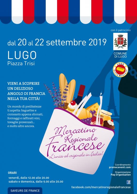 Profumi, sapori e colori d’oltralpe in questa nuova edizione del Mercatino Regionale Francese che si terrà, dal 20 al 22 settembre 2019, a Lugo in Piazza Trisi. Tante le prelibatezze enogastronomiche presenti, tutte rigorosamente di qualità e tradizione francese. Oltre ottanta i tipi di formaggi, i quali potranno essere abbinati ad un’ampia gamma di vini provenienti dalle più importanti regioni vinicole d’Oltralpe. Per i più golosi le "degustazioni dolci" potranno contare sui biscotti bretoni, con oltre venti varietà di ripieno, su un gran numero di cioccolatini dai gusti raffinati, fino ad arrivare ai dolci preferiti da Re ed Imperatori: i macarons. Una grande tavolozza di colori è rappresentata dallo stand delle spezie e, a completamento dell’offerta enogastronomica, non mancheranno baguettes e croissants appena sfornati nello spazio della Boulangerie. In questo piccolo angolo di Francia che si presenta nella tua città troverai anche l'artigianato, con un'ampia gamma di prodotti provenienti da diverse regioni: lavanda, saponi, profumi, tovaglie provenzali e tanto altro ancora… ti aspettiamo!