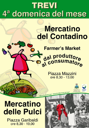 Ogni 4° domenica del mese a Trevi: Mercato Delle Pulci (Piazza Garibaldi 8.30 – 19.00) e il Mercato del Contadino Farmers's Market (Piazza Mazzini 8.30 – 13.00).