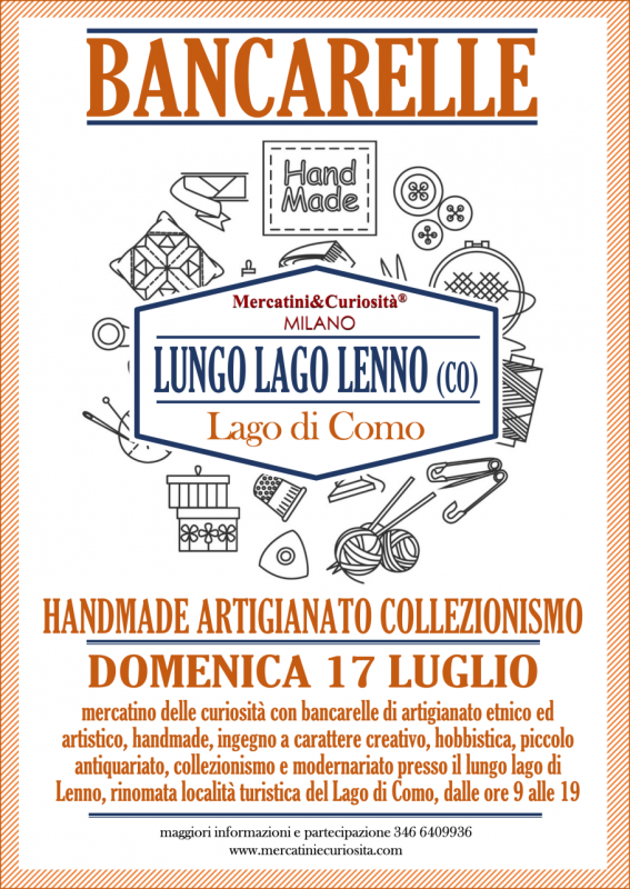Mercatino delle Curiosità con bancarelle di artigianato etnico ed artistico, collezionismo, hand made, ingegno a carattere creativo, riciclo e aziende agricole locali svolto presso il lungo lago nel centro storico di Lenno, rinomata località turistica del Lago di Como.
