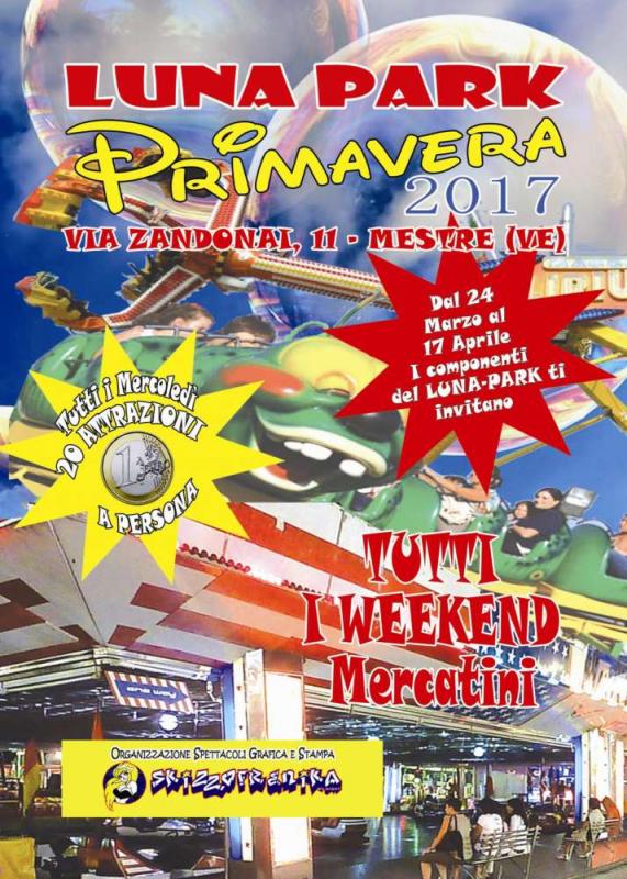 L'Associazione Culturale NSV Organizzazione Eventi affiliata A.I.C.S. - Comitato Provinciale di Rovigo in collaborazione con i Gestori del Luna Park di Mestre (VE), organizzano per le giornate del 25 e 26 Marzo e 01; 02; 08; 09; 15; 16 e 17 Aprile 2017, a Zelarino (VE), in Via Zandonai, 5 (Area Commerciale di Mestre – zona CC Auchan, dietro al Negozio MediaWorld), nell'area verde all'entrata del Parco del Luna Park dalle ore 10:00 alle ore 20:00, i Mercatini di Primavera che prevedono la presenza di Espositori delle Tradizioni Popolari, dell'Artigianato Artistico e delle Opere d'Ingegno Creativo con Curiose ed introvabili Idee Regalo per la Casa ed il Tempo Libero; bancarelle di Prodotti Enogastronomici Tipici Regionali d'Italia con Degustazioni e Specialità Alimentari Dolci e Salate Stagionali; Prodotti e Rimedi Naturali per la Cura del Corpo e del Vivere Sano, Florovivaismo.