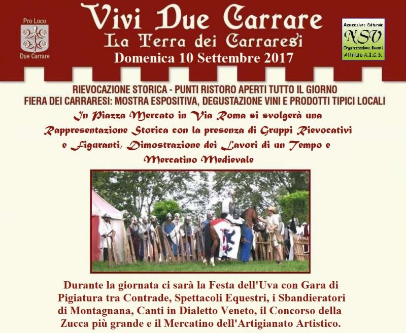 La Pro Loco di Due Carrare (PD) in collaborazione con l'Associazione Culturale NSV Organizzazione Eventi APS affiliata A.I.C.S. - Comitato Provinciale di Rovigo, organizzano per Sabato 03 e Domenica 04 Giugno 2023 a Due Carrare (PD), all'interno dei Giardini Comunali con ingresso da Via dei Granatieri, il Mercatino della Manifestazione “Vivi Due Carrare 2023” che prevede la presenza di Espositori delle Tradizioni Popolari, dell'Artigianato Artistico e delle Opere d'Ingegno Creativo con curiose ed originali Idee Regalo per la Casa ed il Tempo Libero, bancarelle di Prodotti Enogastronomici Tipici Regionali d'Italia e Specialità Alimentari Dolci e Salate Stagionali, Prodotti e Rimedi Naturali per la Cura del Corpo e del Vivere Sano.