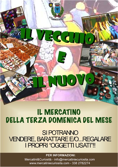 come ogni terza domenica del mese, al mercatino "IL VECCHIO E IL NUOVO", possono partecipare bancarelle di artigianato etnico ed artistico, collezionismo, creatività, ingegno, piccolo antiquariato, hand made, riciclo e riuso, prodotti tipici alimentari e prodotti biologici
