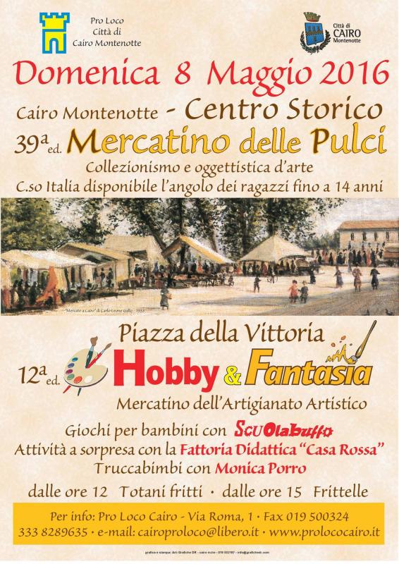 39^ Edizione del Mercatino delle Pulci a Cairo Montenotte l'8 maggio 2016 dove si saranno esposti oggetti da collezionismo e oggettistica d'arte.