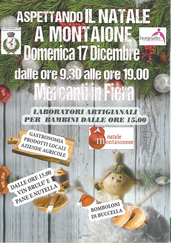 Mercatino di Natale con banchi di artigianato, antiquariato, oggetti natalizi e idee regalo accompagnato da stand di prodotti locali e aziende agricole del territorio. Nel pomeriggio dalle 15 laboratori artigianali per bambini organizzati da due artigani/negozianti montaionesi, uno con la pelle con 'Metello e Simonetta - Gli artigiani della pelle' ed uno con il legno con 'Progetto Legno' di Massimo Fortunati.