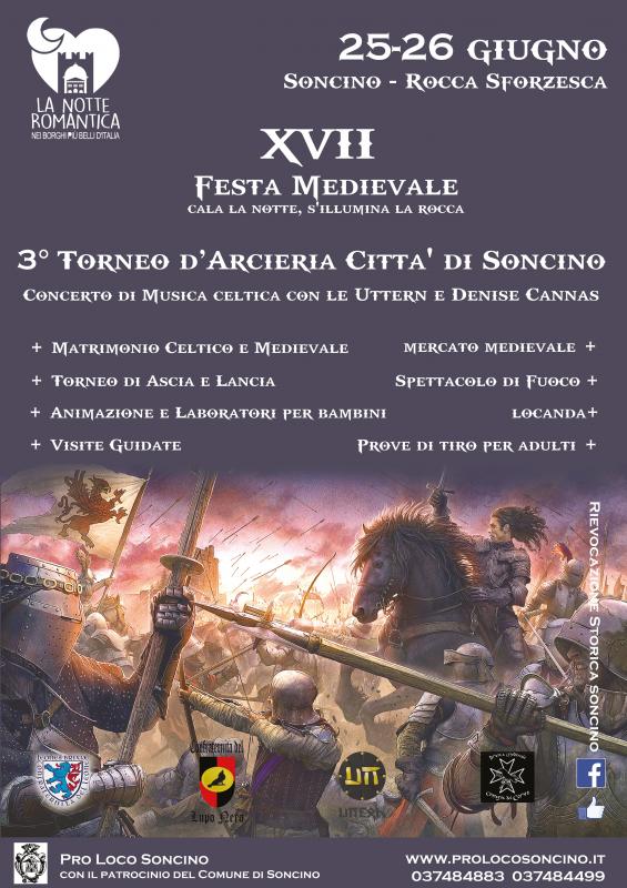 Il fascino di un Borgo Medievale e di una Rocca Sforzesca tra le meglio conservate in Lombardia, un centinaio di figuranti vestiti con abiti d’epoca, accampamenti militari rigorosamente allestiti e un mercato medievale con prodotti accuratamente ricercati e selezionati.E’ quello che la Pro loco di Soncino sta organizzando per la XVII Edizione di “Cala la Notte si Illumina la Rocca” che si terrà a Soncino Sabato 25 e Domenica 26 Giugno.