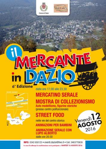 Venerdì 12 Agosto dalle ore 17 si terrà a Dazio (Sondrio) la sesta edizione de Il Mercante in Dazio, mercatino serale in centro paese, accompagnato da Street Food, una mostra collezionistica presso il Centro Polifunzionale, animazioni per i bambini con alle ore 20.30 animazione serale con Lupo Alberto. In caso di maltempo l'evento sarà rinviato a Martedì 16 Agosto.