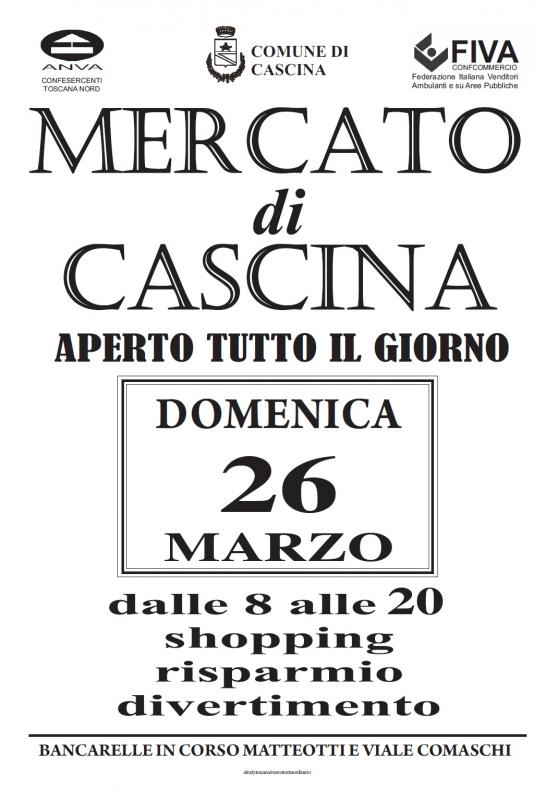 Domenica prossima, 26 marzo 2017, dalle ore 8 alle ore 20, in corso Matteotti e viale Comaschi, si terrà l'edizione straordinaria del mercato settimanale di Cascina. Shopping, risparmio e divertimento. (dp)