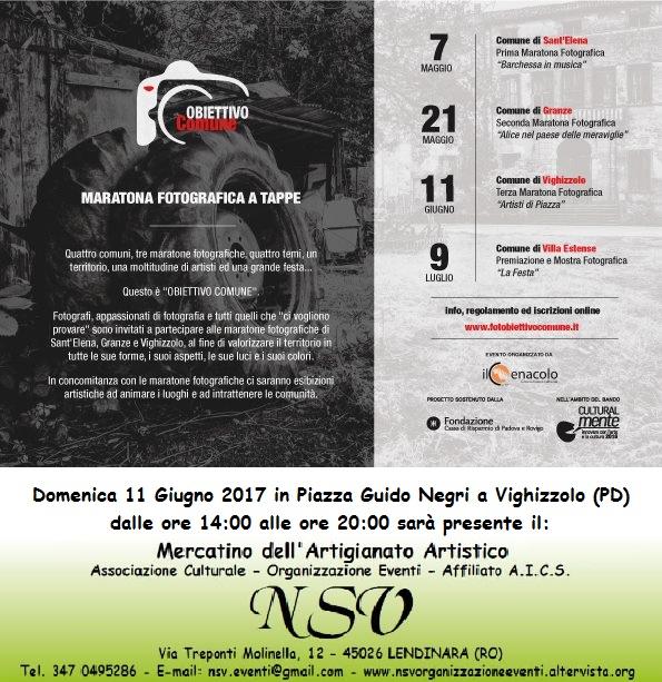 Il Circolo Musico-Culturale “Il Cenacolo” in collaborazione con l'Associazione Culturale NSV Organizzazione Eventi affiliata A.I.C.S. - Comitato Provinciale di Rovigo, organizzano per Domenica 11 Giugno 2017 a Vighizzolo (PD), in Piazza Guido Negri, dalle ore 14:00 alle ore 20:00 la Manifestazione “Artisti di Piazza”, che prevede il Mercatino con la presenza di Espositori delle Tradizioni Popolari, dell'Artigianato Artistico e delle Opere d'Ingegno Creativo con Curiose ed introvabili Idee Regalo per la Casa ed il Tempo Libero; Prodotti e Rimedi Naturali per la Cura del Corpo e del Vivere Sano.