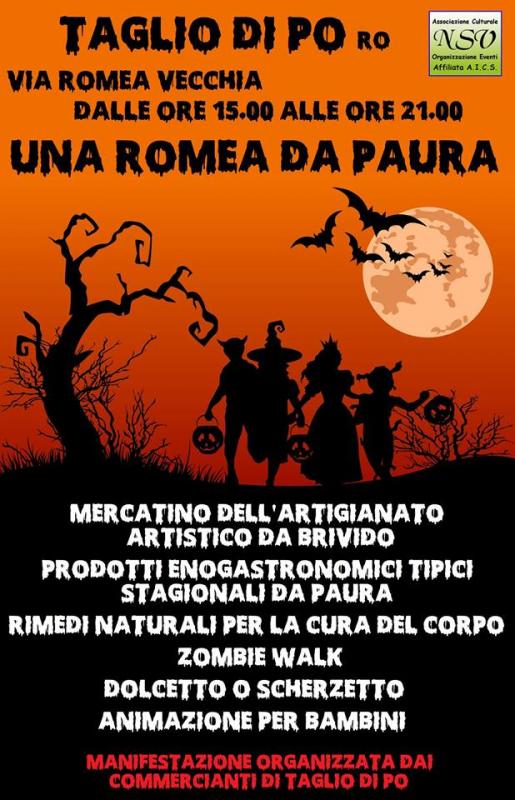 I Commercianti di Taglio di Po (RO) in collaborazione con l'Associazione Culturale NSV Organizzazione Eventi affiliata A.I.C.S. - Comitato Provinciale di Rovigo, organizzano per Martedì 31 Ottobre 2017 a Taglio di Po (RO), in Via Romea Vecchia dalle ore 15:00 alle ore 21:00, la Manifestazione “Una Romea da Paura”, che prevede la presenza del Mercatino delle Tradizioni Popolari, dell'Artigianato Artistico e delle Opere d'Ingegno Creativo con Curiose ed introvabili Idee Regalo per la Casa ed il Tempo Libero; bancarelle di Prodotti Enogastronomici Tipici Regionali d'Italia e Specialità Alimentari Dolci e Salate Stagionali; Prodotti e Rimedi Naturali per la Cura del Corpo e del Vivere Sano.