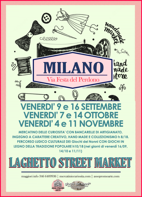 Nei Venerdì 16 Settembre, 14 Ottobre e 11 Novembre sempre presso Via Festa del Perdono, a corollario del mercatino Laghetto Street Market, sarà presene il percorso ludico culturale dei Giochi dei Nonni composto da giochi in legno della tradizione popolare, realizzati artigianalmente secondo gli schemi di una volto, a riproduzione fedele dei giochi dei nostri antenati e usufruibili gratuitamente dalla cittadinanza e dal turismo.