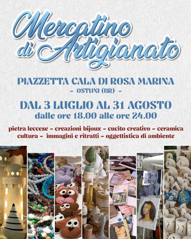 Si terrà dal 03 Luglio al 31 Agosto 2021 a Ostuni (BR) il Mercatino di Artigianato e di Prodotti Tipici dalle ore 18.00 alle ore 24.00 presso la Piazzetta Cala di Rosa Marina.