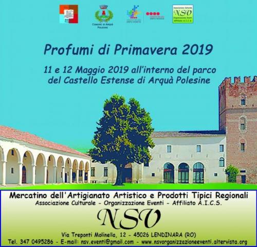 La Pro Loco di Arquà Polesine (RO) in collaborazione con l'Associazione Culturale NSV Organizzazione Eventi affiliata A.I.C.S. - Comitato Provinciale di Rovigo, organizzano per Sabato 11 e Domenica 12 Maggio 2019 ad Arquà Polesine (RO), all'interno del Parco del Castello Estense, in Via Mazzini 18-30, la Manifestazione “Profumi di Primavera 2019”, che prevede il Mercatino di Prodotti Enogastronomici a Km 0, Prodotti Tipici Regionali d'Italia e Specialità Alimentari Dolci e Salate Stagionali; la presenza di Espositori delle Tradizioni Popolari, dell'Artigianato Artistico e delle Opere d'Ingegno Creativo con Curiose ed introvabili Idee Regalo per la Casa ed il Tempo Libero; Prodotti e Rimedi Naturali per la Cura del Corpo e del Vivere Sano.Il programma della Manifestazione prevede Spettacoli e Intrattenimenti Musicali, Animazioni per Bambini e Adulti.Sarà inoltre presente il Ristorante con Pranzo e Cene sotto le Barchesse.