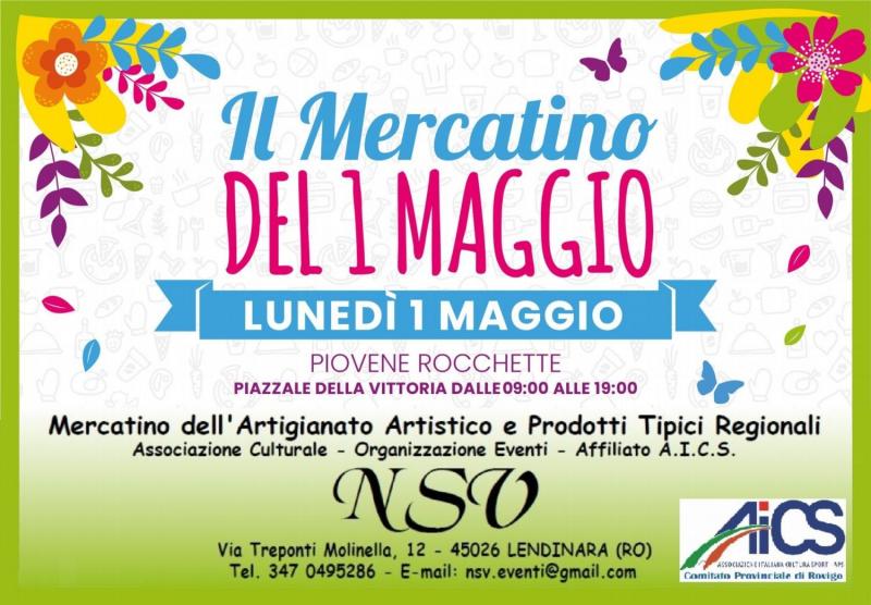 La Pro Loco di Piovene Rocchette (VI), in collaborazione con l'Associazione Culturale NSV Organizzazione Eventi APS affiliata A.I.C.S. - Comitato Provinciale di Rovigo, organizzano per Lunedì 01 Maggio 2023, a Piovene Rocchette (VI), in Piazzale della Vittoria dalle ore 09:00 alle ore 19:00 il Mercatino del I° Maggio, che prevede la presenza di Espositori delle Tradizioni Popolari, dell'Artigianato Artistico e delle Opere d'Ingegno Creativo con curiose ed originali Idee Regalo per la Casa ed il Tempo Libero, bancarelle di Prodotti Enogastronomici Tipici Regionali d'Italia e Specialità Alimentari Dolci e Salate Stagionali, Prodotti e Rimedi Naturali per la Cura del Corpo e del Vivere Sano.Saranno presenti Giochi Gonfiabili; Truccabimbi dalle ore 15:00; Magic Show dalle ore 16:30.Punti Ristoro a cura della Pro Loco Frittelle, Panini Caldi e Arrosticini.