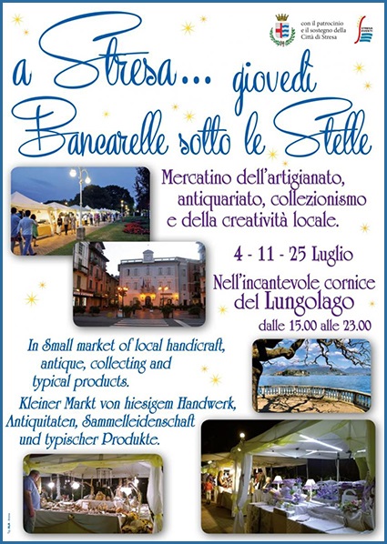 A Stresa in provincia di Verbano-Cusio-Ossola si svolge nei giorni di Giovedì 04, 11 e 25 Luglio 2019 il Mercatino dell'artigianato, antiquariato, collezionismo e dei prodotti tipici locali, Bancarelle Sotto Le Stelle.