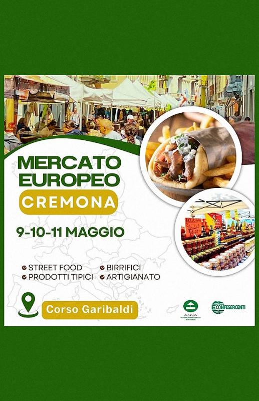 Torna anche quest’anno a Cremona il Mercato Europeo. Dal 09 all'11 Maggio in centro (in corso Campi, corso Garibaldi e Piazza Cittanova) dalle 10.00 alle 24.00 un mercato a cielo aperto con area street food, enogastronomia e prodotti tipici.