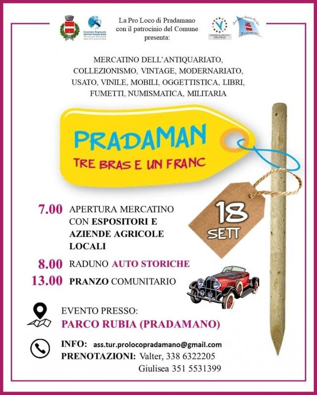 Organizzato dalla Pro loco di Pradamano e con il patrocinio del Comune per la prima volta a Pradamano si terra’ il mercatino dell'usato Pradam tre bras e un franc....e non solo, presso il parco Rubia. Ricca la proposta dei numerosi espositori per i collezionisti e i curiosi. Si potranno così trovare libri usati, mobili antichi, dischi, giochi e giocattoli, pezzi di ricambio, macchine fotografiche, monete, francobolli, fumetti, cartoline, orologi, ceramiche, oggettistica varia e attrezzi di una volta. Spazio anche al mercatino dei bambini e alle aziende con i loro prodotti alimentari. Garantito anche il banco stree food. I banchi saranno aperti dalle 08.00 alle 19.00.