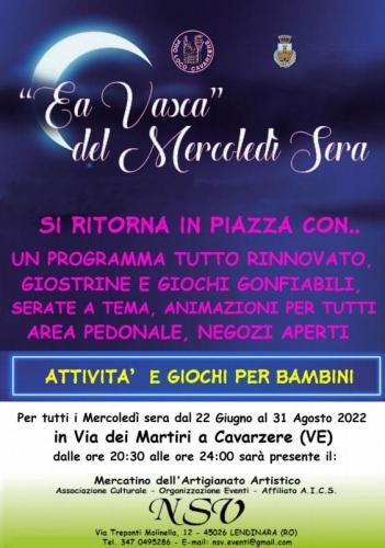 La Pro Loco di Cavarzere (VE), in collaborazione con l'Associazione Culturale NSV Organizzazione Eventi APS affiliata A.I.C.S. - Comitato Provinciale di Rovigo, organizzano per tutti i Mercoledì sera dal 22 Giugno al 31 Agosto 2022, a Cavarzere (VE), in Via dei Martiri dalle ore 20:30 alle ore 24:00 i Mercatini della Manifestazione "Ea Vasca del Mercoledì Sera" che prevedono la presenza di Espositori delle Tradizioni Popolari, dell'Usato/Antiquariato/Vintage, dell'Artigianato Artistico e delle Opere d'Ingegno Creativo con Idee Regalo per l'Estate, Prodotti e Rimedi Naturali per la Cura del Corpo e del Vivere Sano.