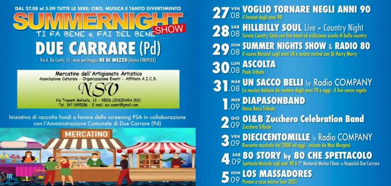 Gli Organizzatori del Summernight Show in collaborazione con l'Amministrazione Comunale di Due Carrare (PD) e l'Associazione Culturale NSV Organizzazione Eventi affiliata A.I.C.S. - Comitato Provinciale di Rovigo, organizzano dal 27 Agosto al 05 Settembre 2021, a Due Carrare (PD), in Via Antonio de Curtis, 15 - area parcheggio "Re di Mezzo" (dietro Cineplex) dalle ore 19:00 alle ore 24:00 il Mercatino del Summernight Show, che prevede la presenza di Espositori delle Tradizioni Popolari, dell'Usato/Antiquariato/Vintage, dell'Artigianato Artistico e delle Opere d'Ingegno Creativo con Idee Regalo per l'Estate, Prodotti e Rimedi Naturali per la Cura del Corpo e del Vivere Sano.Il programma completo della Manifestazione prevede per tutte le serate Spettacoli Musicali e Concerti con le migliori Band del Momento.