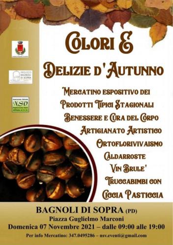 La Pro Loco di Bagnoli di Sopra (PD), in collaborazione con l'Amministrazione Comunale e l'Associazione Culturale NSV Organizzazione Eventi affiliata A.I.C.S. - Comitato Provinciale di Rovigo, organizzano per Domenica 07 Novembre 2021, a Bagnoli di Sopra (PD), in Piazza Guglielmo Marconi, dalle ore 09:00 alle ore 19:00 la Manifestazione "Colori e Delizie d'Autunno", che prevede il Mercatino Autunnale con la presenza di Espositori delle Tradizioni Popolari, dell'Usato/Antiquariato/Vintage, dell'Artigianato Artistico e delle Opere d'Ingegno Creativo con curiose ed originali Idee Regalo tematiche, bancarelle di Prodotti Enogastronomici Tipici Regionali d'Italia e Specialità Alimentari Dolci e Salate Stagionali, Prodotti e Rimedi Naturali per la Cura del Corpo e del Vivere Sano, Operatori dell'Orto-Flori-Vivaismo.