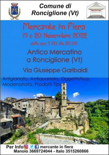 In Via Garibaldi a Ronciglione in provincia di Viterbo si svolge nei giorni 19 e 20 Novembre 2022, dalle ore 09.00 alle ore 20.00, l'Antico Mercatino di Artigianato, Antiquariato, Oggettistica, Modernariato e Prodotti Tipici.