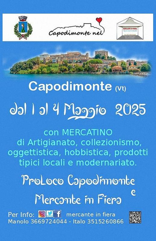 Sul Lungolago di Capodimonte in provincia di Viterbo si svolge nei giorni dal 01 al 04 Maggio 2025 il Mercante in Fiera, il Mercatino di artigianato, oggettistica, prodotti tipici locali e delle Regioni Italiane.