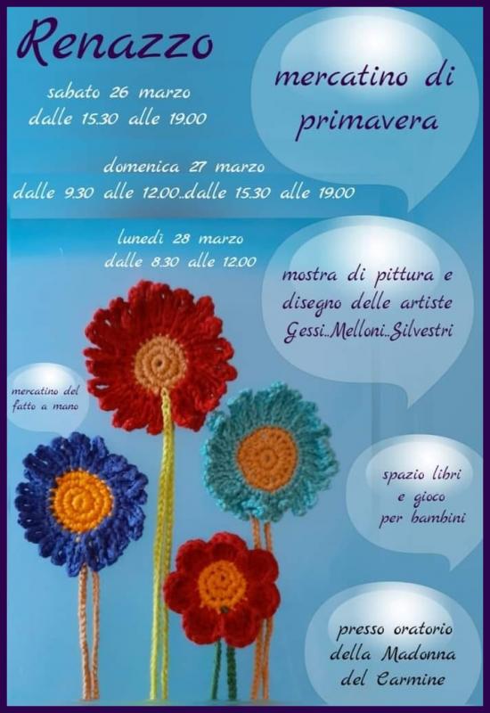 Presso l'Oratorio della Madonna del Carmine a Renazzo, frazione del Comune di Cento in provincia di Ferrara si svolge nei giorni 26, 27, 28 Marzo 2022 il Mercatino di Primavera.