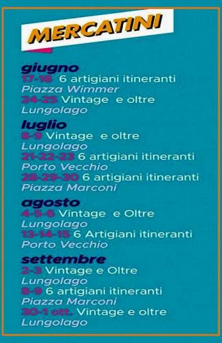8-9 luglio Vintage e oltre Lungolago 21-22-23 luglio 6 artigiani itineranti Porto Vecchio18-19-30 luglio 6 artigiani itineranti Piazza Marconi