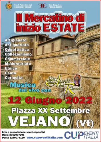 In Piazza XX Settembre a Vejano in provincia di Viterbo si svolge nella giornata di Domenica 12 Giugno 2022 il Mercatino di Inizio Estate.