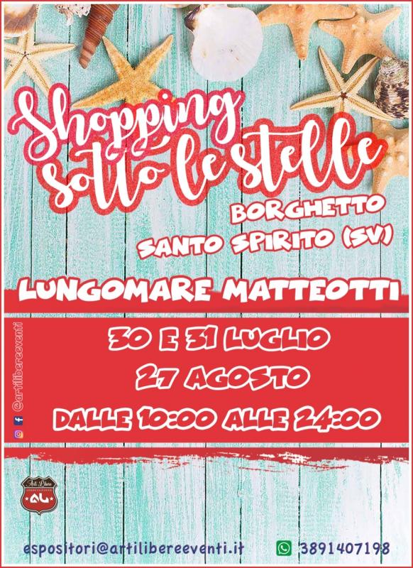 Presso il Lungomare Matteotti a Borghetto Santo Spirito in provincia di Savona si svolge nei giorni 30, 31 Luglio e 27 Agosto 2022, dalle ore 10.00 alle ore 24.00, il mercatino Shopping sotto le Stelle.