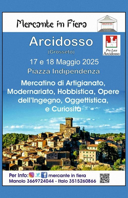 In Piazza Indipendenza ad Arcidosso in provincia di Grosseto si svolge nei giorni 17 e 18 Maggio 2025 il Mercatino Mercante in Fiera.