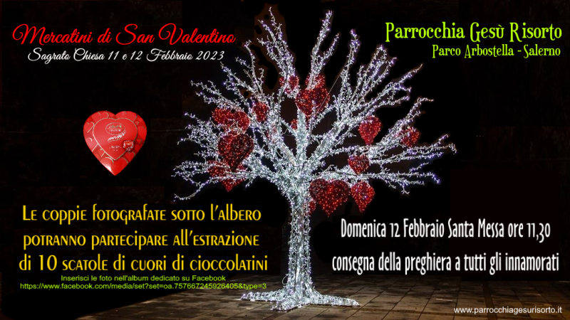 Sabato 11 pomeriggio e Domenica 12 Febbraio fino alle ore 21,00 sul sagrato della Parrocchia Gesù Risorto, al Parco Arbostella, si terrà la 1^ edizione dei “Mercatini di San Valentino”, esposizione di prodotti artigianali a tema vario realizzati da alcuni componenti i gruppi parrocchiali.