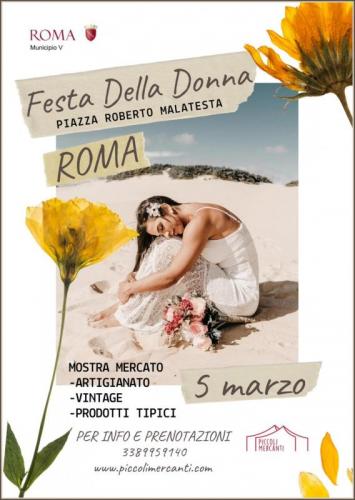 In Piazza Roberto Malatesta a Roma nella giornata di Domenica 05 Marzo 2023, in occasione della Festa della Donna, l'Associazione Piccoli Mercanti organizza una Mostra Mercato di Artigianato, Vintage e Prodotti Tipici.