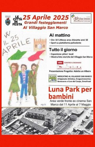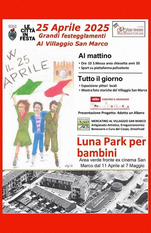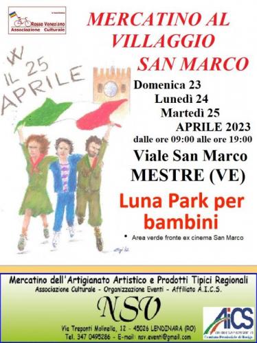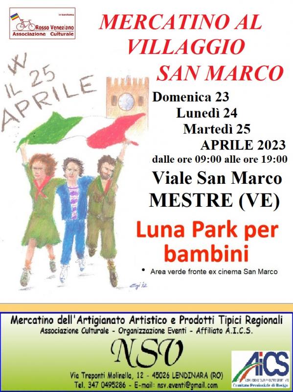 L'Associazione Culturale NSV Organizzazione Eventi APS affiliata A.I.C.S. - Comitato Provinciale di Rovigo, sarà presente in occasione dei "Festeggiamenti al Villaggio San Marco" nella giornata di Venerdì 25 Aprile 2025, a Mestre (VE), nell'area verde perdonale in Viale San Marco, dalle ore 09:00 alle ore 19:00 con il Mercatino delle Tradizioni Popolari, dell'Artigianato Artistico e delle Opere d'Ingegno Creativo con curiose ed originali Idee Regalo per la Casa ed il Tempo Libero con dimostrazioni pratiche delle tecniche di lavorazione sul posto, la rassegna dei Prodotti Enogastronomici Tipici Regionali ed Italiani con Degustazioni e Specialità Alimentari Dolci e Salate Stagionali prodotti artigianalmente per esaltare i Gusti e i Sapori di una tradizione antica ormai persa.