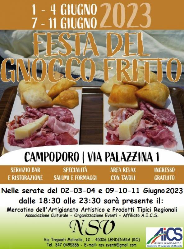 L'Associazione Culturale NSV Organizzazione Eventi APS affiliata A.I.C.S. - Comitato Provinciale di Rovigo, sarà presente nelle serate dal 02 al 04 e dal 09 all'11 Giugno 2023, a Campodoro (PD), nell'area interna del Centro Parrocchiale, in Via Palazzina, 1 dalle ore 18:30 alle ore 23:30 con il Mercatino della "Festa del Gnocco Fritto", che prevede la presenza di Espositori delle Tradizioni Popolari, dell'Artigianato Artistico e delle Opere d'Ingegno Creativo con curiose ed originali Idee Regalo per la Casa ed il Tempo Libero, bancarelle di Prodotti Enogastronomici Tipici Regionali d'Italia e Specialità Alimentari Dolci e Salate Stagionali, Prodotti e Rimedi Naturali per la Cura del Corpo e del Vivere Sano.